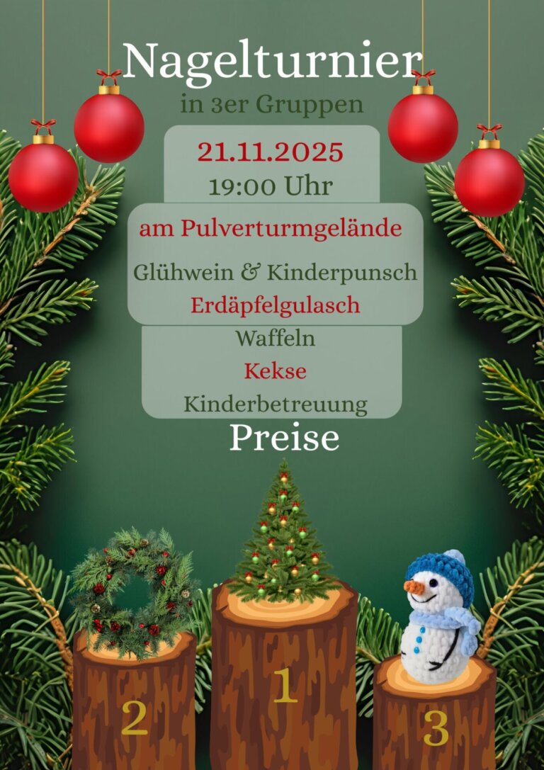 Wir möchten euch anlässlich unseres 2. Nagelturniers am 21. November 2025 beginnend um 19:00 Uhr auf das Pulverturmgelände einladen. Von uns RaRo werdet ihr mit Glühwein, Kinderpunsch, Erdäpfelgulasch sowie  köstlichen Waffeln versorgt.