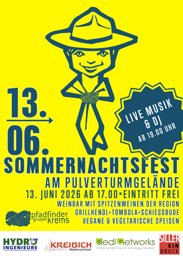 Auch heuer dürfen wir euch wieder herzlich zu unserem alljährlichen Sommernachtsfest am 13.06.2026 am Pulverturmgelände in Krems einladen.